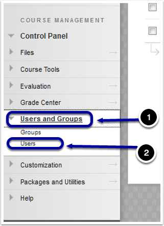 Under the course management menu on the left hand side of the screen- locate the “Users and Groups” section and click on it (1). Next, click on “Users” under the “Users and Groups” section (2).